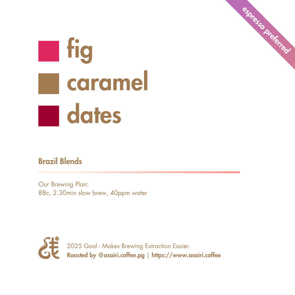We blend at least two seasonal Brazilian coffee in this blend target to deliver a complex version of your every day coffee. Our roasting typically locked at a light-medium roasting level to deliver more yellow/red fruit notes, red dates sweetness and also orange juice texture. Sometimes might have berries notes depends on your grinder type.
