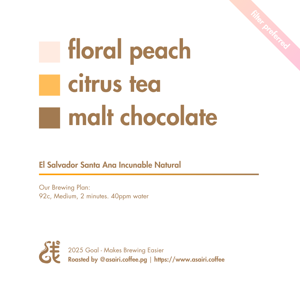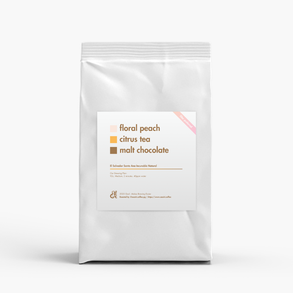 From the highlands of Santa Ana comes Incunable, a natural-processed coffee that beautifully blends elegance with comforting depth. The first sip reveals gentle floral peach—soft, fragrant, and inviting—setting the tone for a cup that’s both bright and soothing. Notes of citrus tea follow, bringing a refreshing clarity that lifts the profile without overpowering it. As the cup cools, a mellow malt-chocolate sweetness emerges, adding warmth and rounding out the experience with a smooth, satisfying finish.