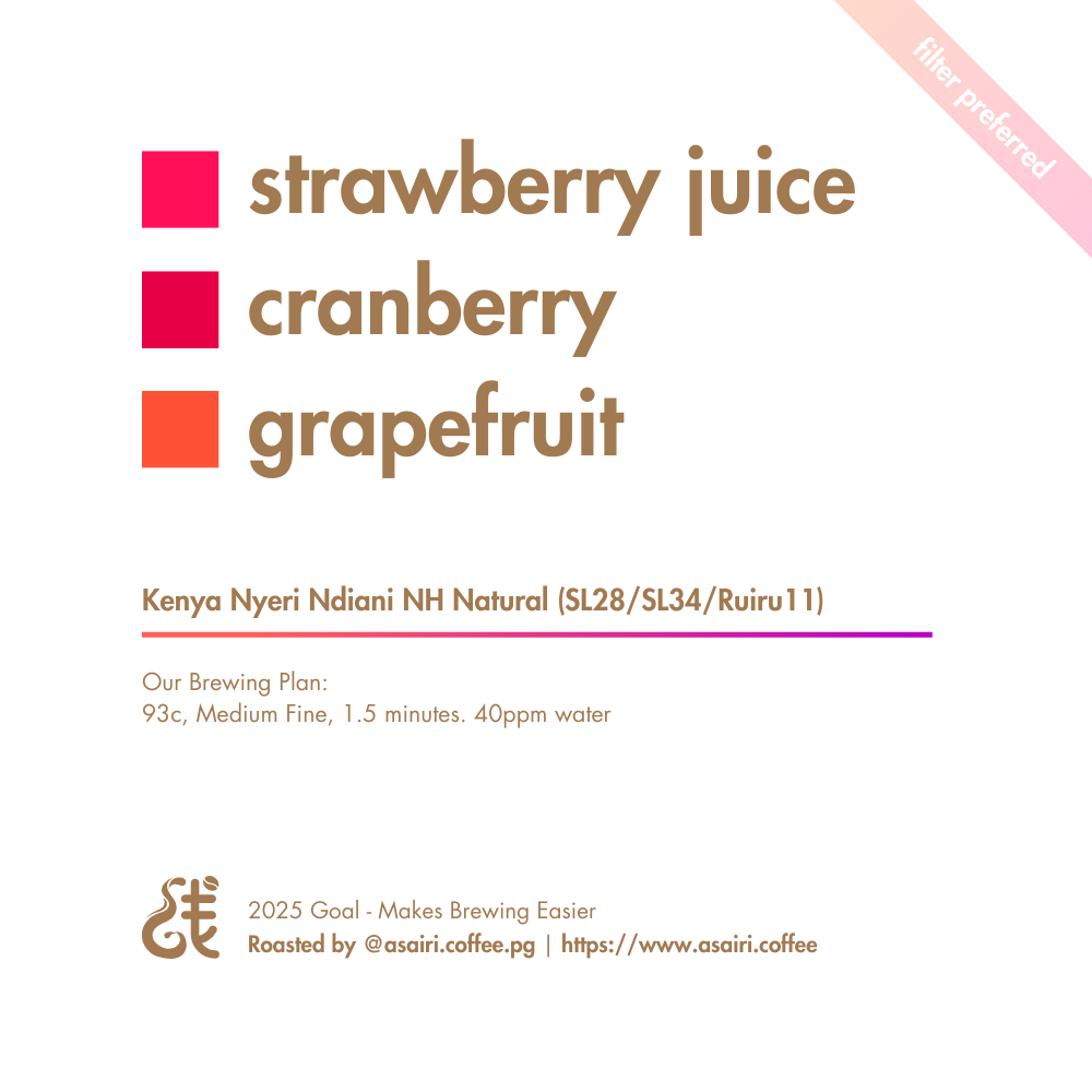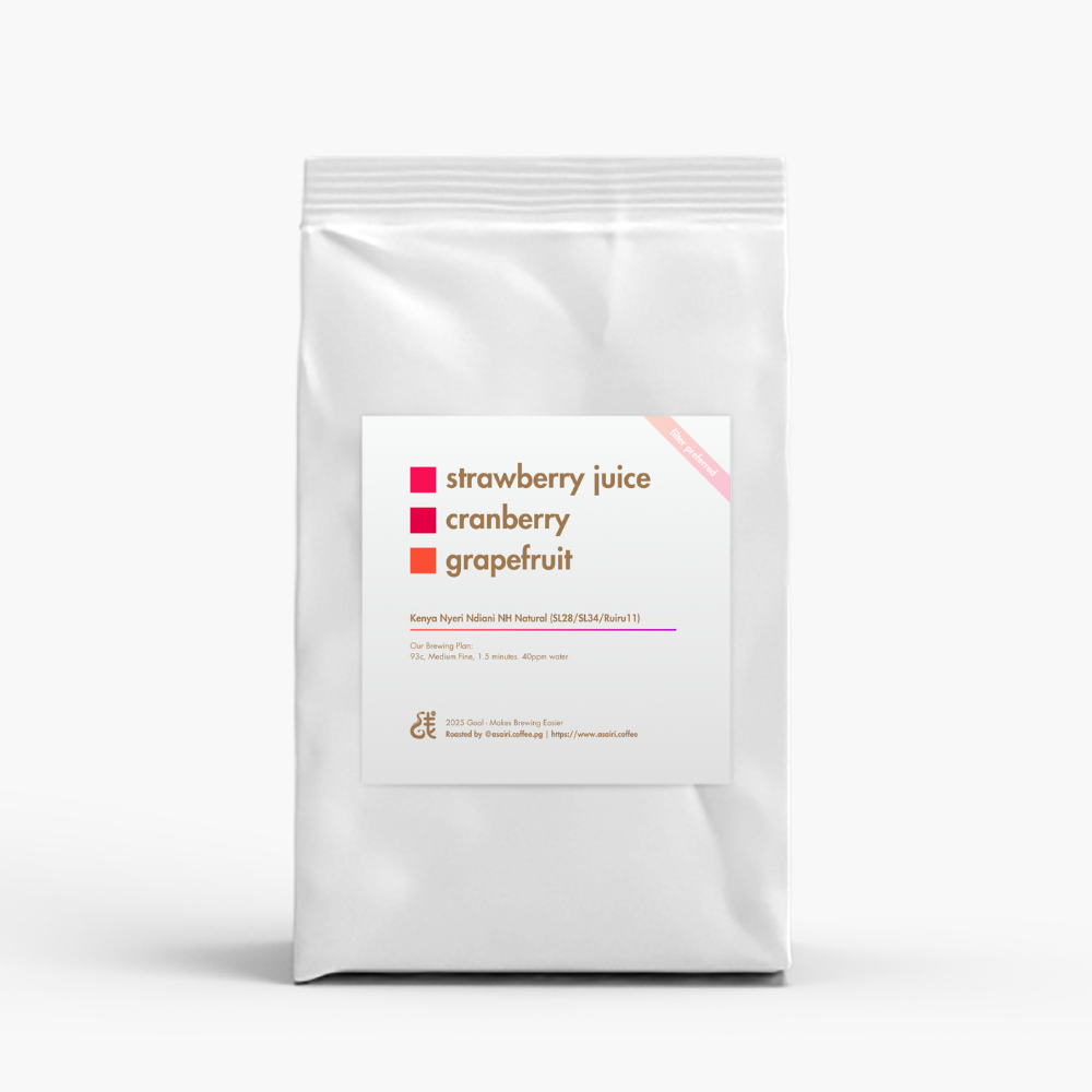 This natural-processed coffee from Nyeri delivers a vibrant and juicy expression of Kenyan terroir. The cup bursts open with the sweetness of fresh strawberry juice, followed by the lively tartness of cranberry. A bright grapefruit note weaves through the profile, adding citrus clarity and a refreshing lift to the finish.